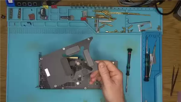 技术员Tony拆开显卡后,首先映入眼帘的是背面显存芯片的糟糕散热,这些芯片仅由一个脆弱的支架固定,散热效果极差,此外风扇线缆被夹住,显示出此前的维修过程非常粗糙。