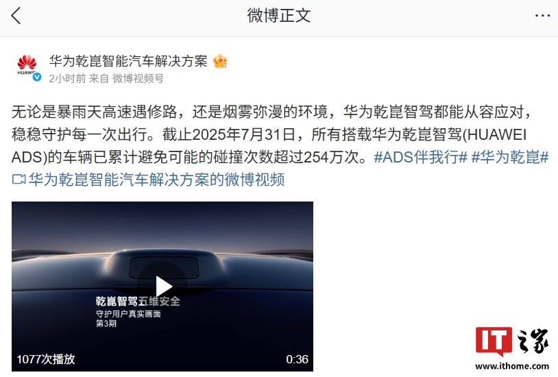 8 月 12 日消息,华为智能汽车解决方案 BU 官方微博今日公布数据:截止 2025 年 7 月 31 日,所有搭载华为乾崑智驾(HUAWEI ADS)的车辆已累计避免可能的碰撞次数超过 254 万次。