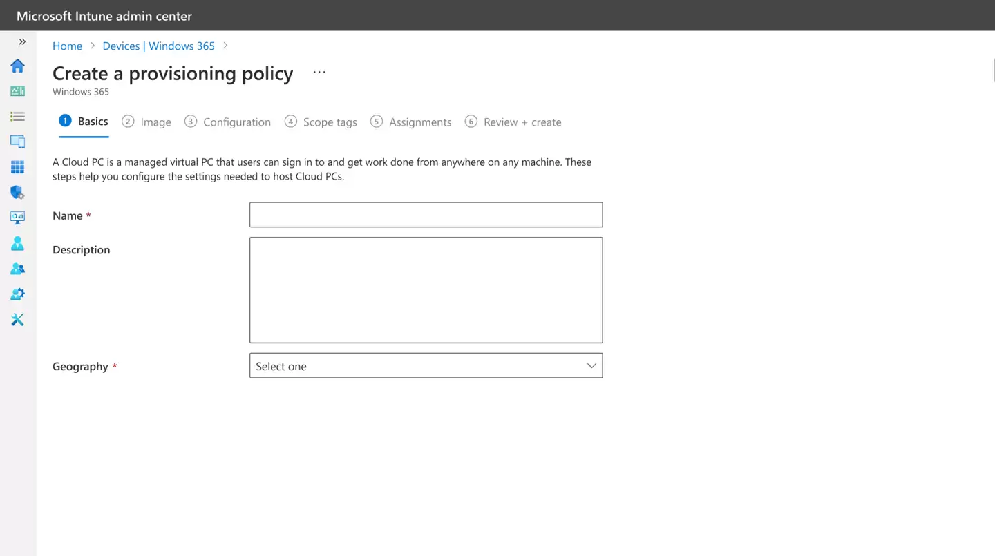 企业在购买 Windows 365 Reserve 许可后,管理员需创建精简的预配策略,包括云 PC 的创建区域、适用用户组及可选的系统镜像与语言设置。