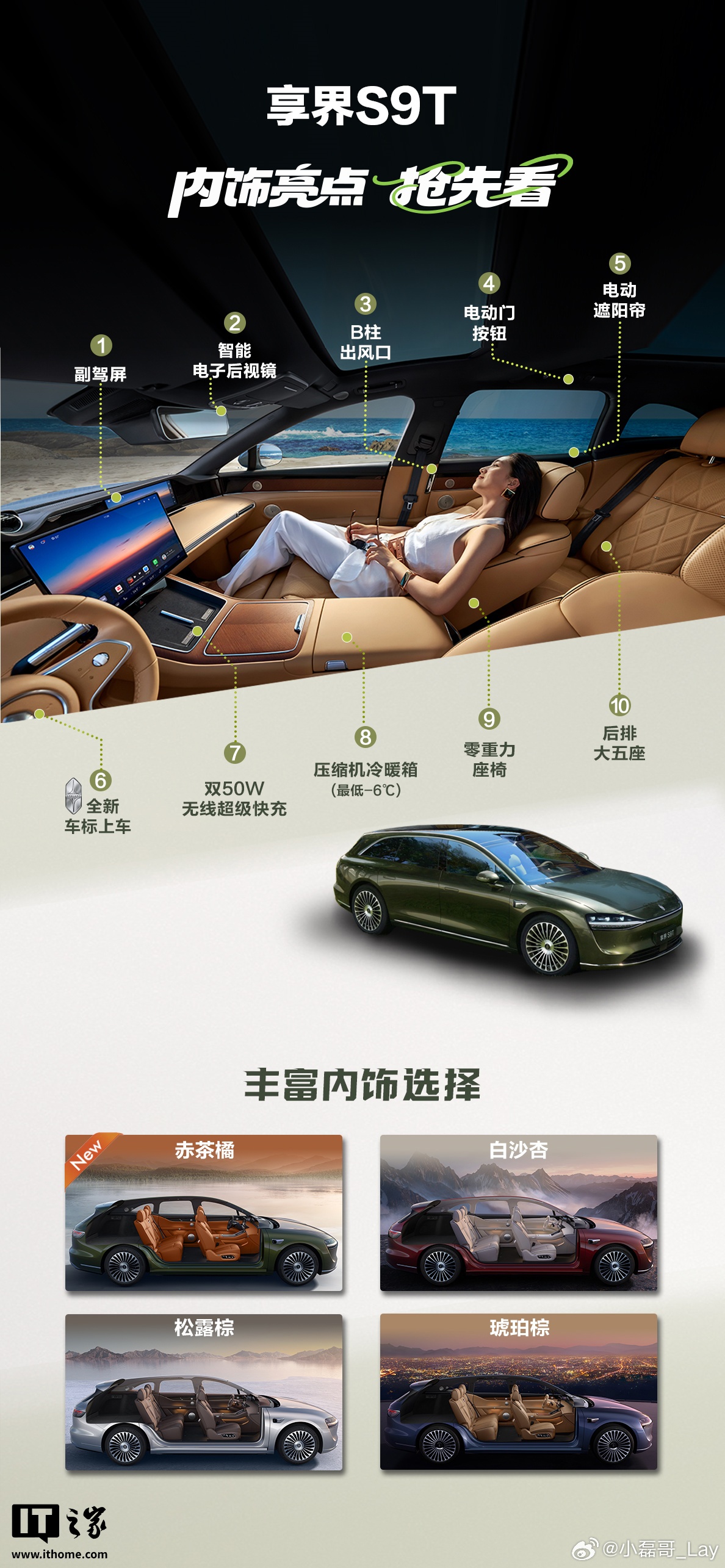 注意到,华为智选车产品总监(享界系列)彭磊刚刚公布了享界 S9T 旅行车内饰亮点信息。新车将配备副驾屏、智能电子后视镜、B 柱出风口、电动门按钮、电动遮阳帘、全新车标方向盘、双 50W 无线超级快充、压缩机冷暖箱(最低-6℃)、副驾零重力座椅、后排大五座。