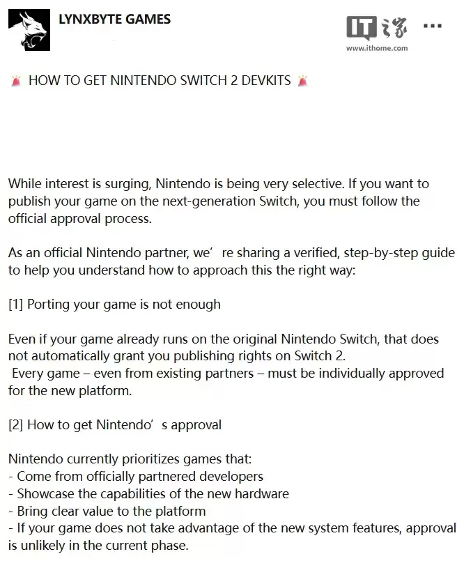 8 月 12 日消息,任天堂官方合作伙伴 Lynxbyte Games 昨天在领英曝光了 Switch 2 开发机的申领条件。