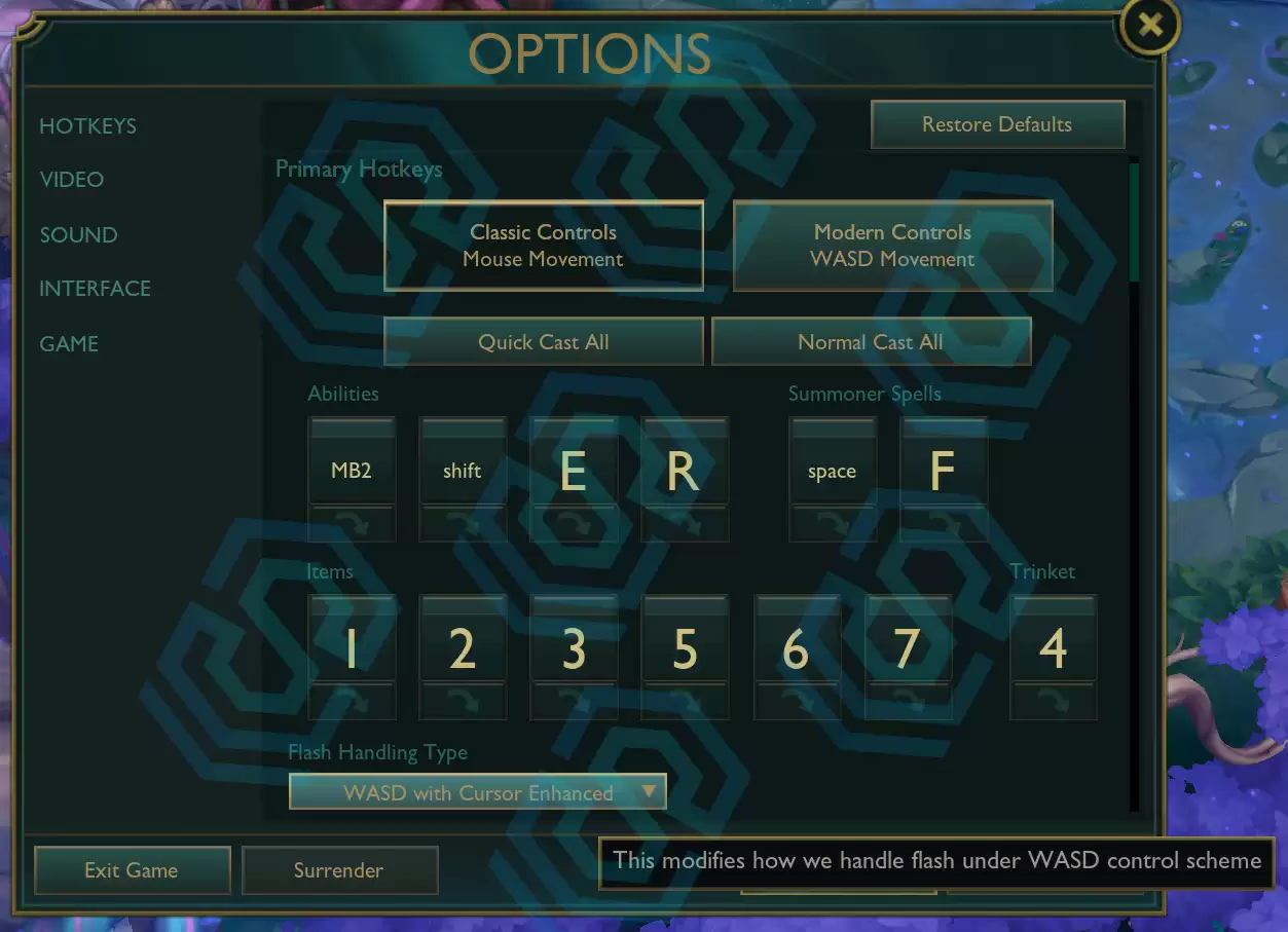 数据挖掘者 SkinSpotlights 曾在 5 月 14 日爆料《英雄联盟》即将加入 WASD 键操作模式,当时的爆料截图显示原有的 Q 和 W 技能键变成了鼠标右键、Shift 键,召唤师技能 D 键变成了空格键。