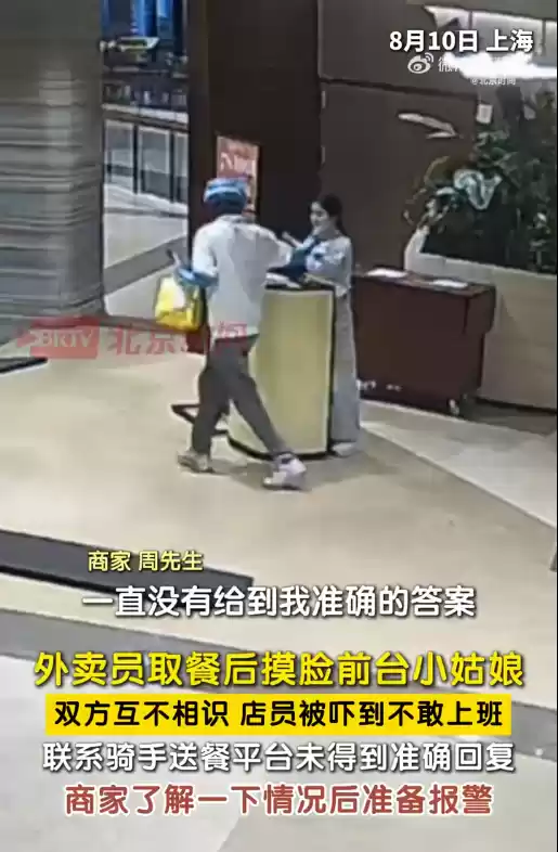 8月12日消息,近日,上海一外卖员取餐摸前台姑娘的脸,引发网友热议。