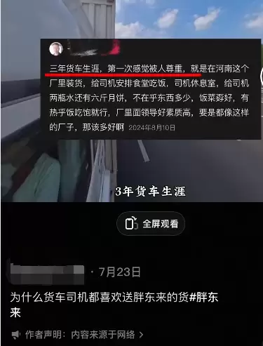 此前,还有司机表示自己从事几年货车生涯,在胖东来第一次感觉被人尊重,他透露在胖东来装货,不仅给司机安排食堂吃饭,还提供司机休息室。