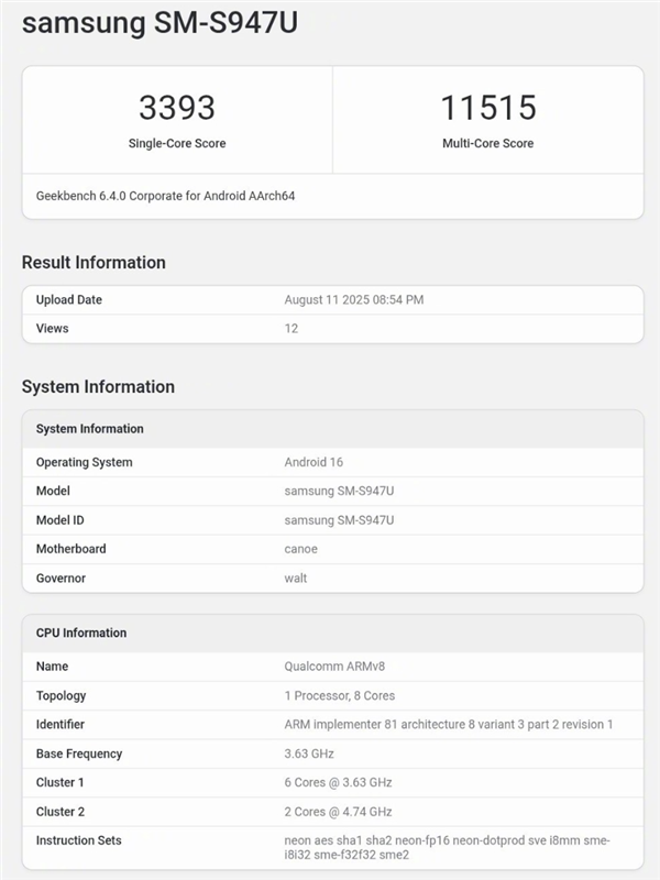 8月12日消息,高通骁龙8 Elite 2的跑分在Geekbench 6数据库出现,其中显示测试机型为“Samsung SM-S947U”。