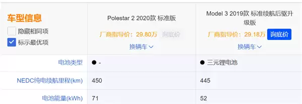 拿当时的极星2和特斯拉Model 3来说,极星2用71度电,才达到NEDC续航450km,而Model 3用52度电,NEDC续航就有445km。