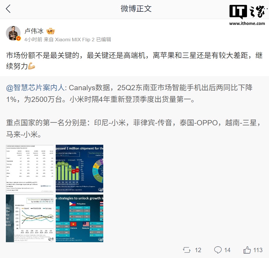 对此,小米集团合伙人、总裁、手机部总裁、小米品牌总经理卢伟冰表示:“市场份额不是最关键的,最关键还是高端机,离苹果和三星还是有较大差距,继续努力。”