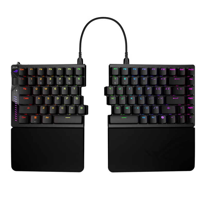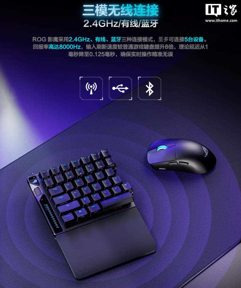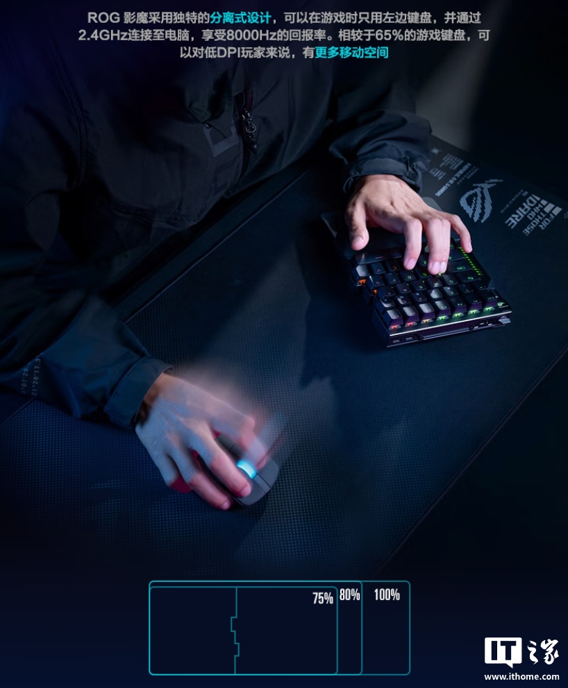 据介绍,华硕 ROG 影魔键盘采用分离式设计,可在游戏时只使用左边键盘,并通过 2.4GHz 连接至电脑,支持 8000Hz 回报率。键盘配备两套不同高度的撑脚,可提供五种人体工学倾斜角度。