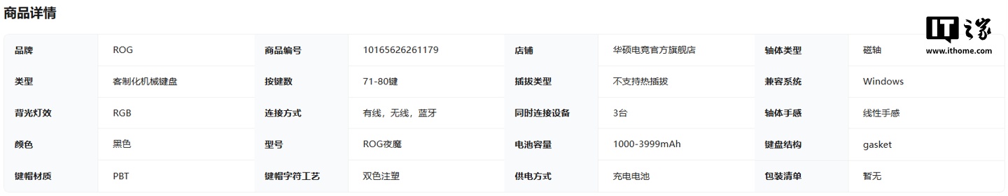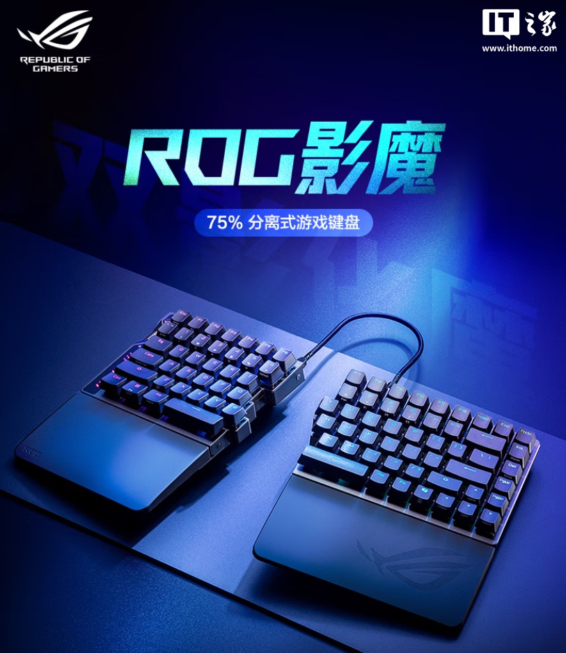 8 月 13 日消息,华硕 ROG 影魔 75% 分离式键盘今日晚正式上市开售,新品搭载 HFX V2 磁轴、支持无线 8K 回报率,售价 2599 元。