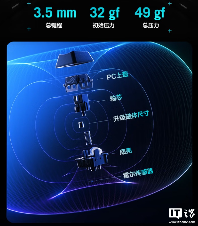 新品键盘搭载全新 ROG HFX V2 第二代磁轴,轴芯与底壳选用 POM 材质,按键寿命达 1 亿次。HFX V2 磁轴还支持自定义触发行程,可实现 0.1mm 精度调节。
