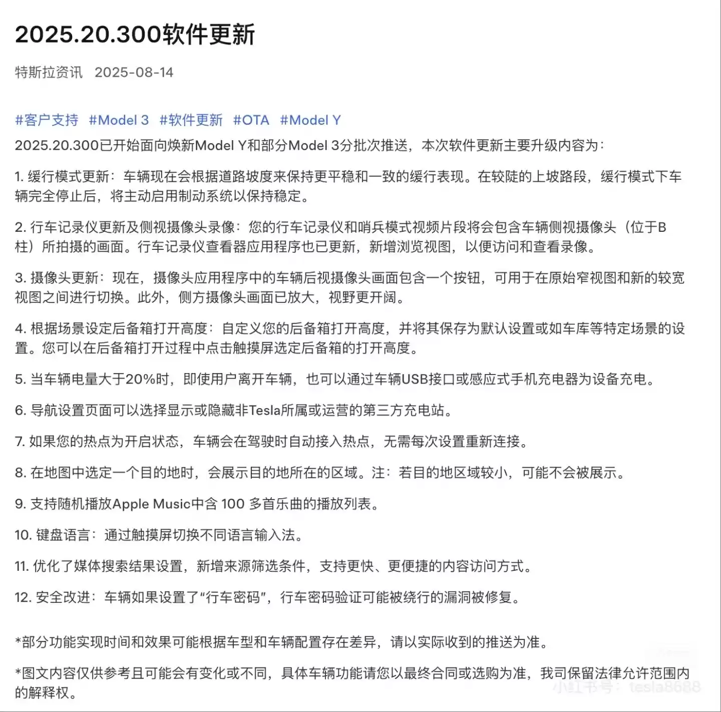 8月14日最新消息,特斯拉官方宣布,2025.20.300版本软件更新已正式启动,首批面向焕新版Model Y及部分Model 3车型用户进行分阶段推送。