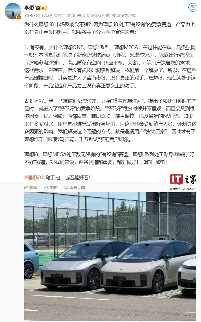 8 月 14 日消息,理想汽车 CEO 李想今日发文回应了“为什么理想 i8 市场反响会不错?”这一问题。他表示,因为理想 i8 处于“有没有”的竞争赛道,产品力上没有真正意义的对手。如果将竞争分为两个赛道来看: