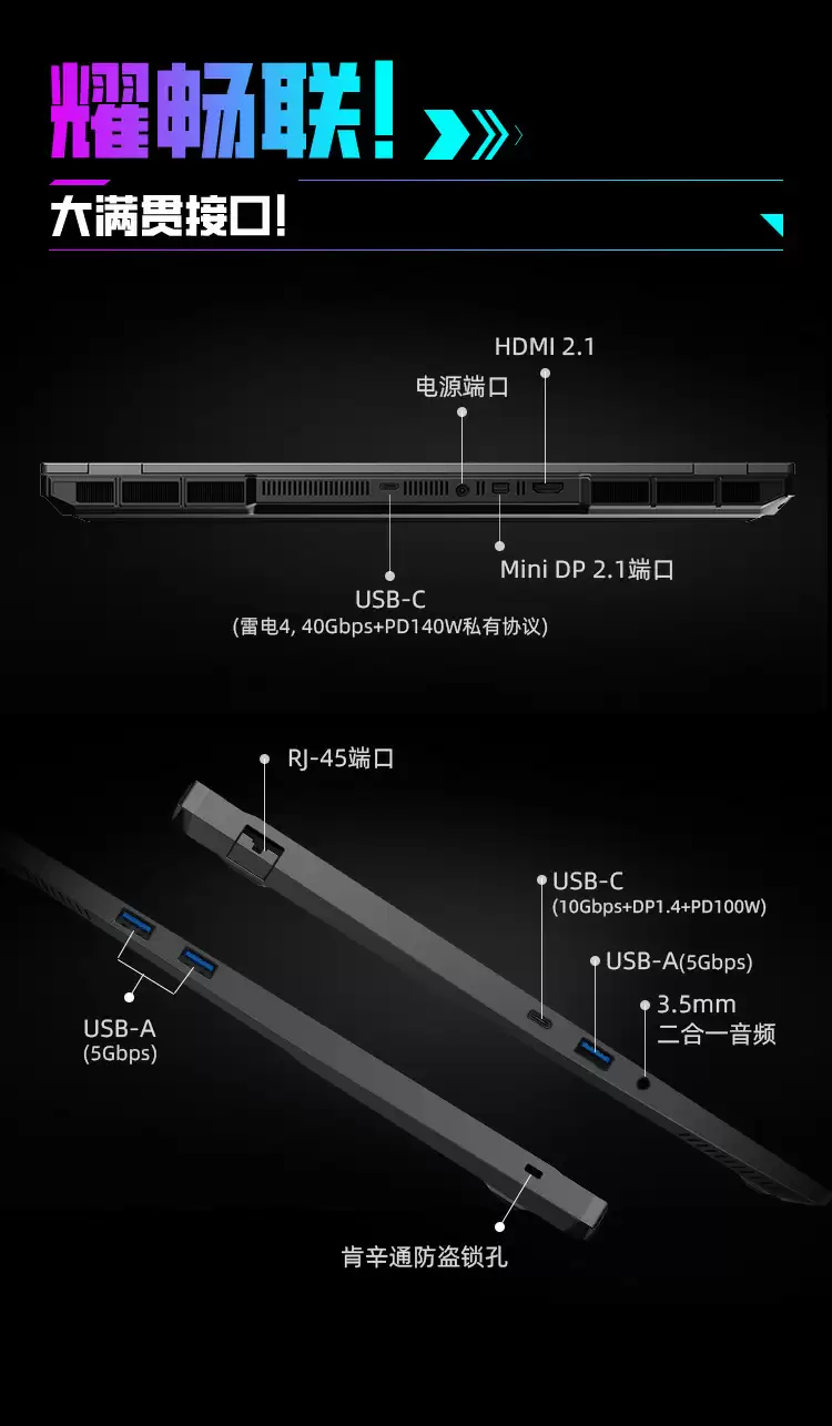 该机搭载 20 核心 20 线程英特尔酷睿 Ultra 7 255HX 处理器,配备 32GB 双槽 DDR5 5600 RAM 内存、1TB TLC SSD(双盘位),三风扇散热,无水冷接口,双烤 200W(单烤 140W + 115W),静音狂暴模式下 40dB;搭载 80Wh 电池,配备 250W SiC 小型适配器,重约 2.55kg。