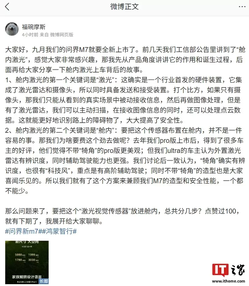 据悉,问界M7产品负责人@福碗摩斯今日通过社交平台分享了舱内激光技术研发背后的故事: