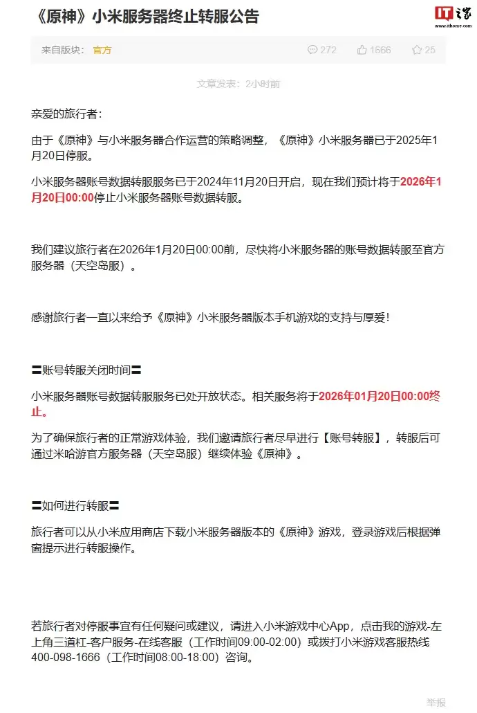 1 月 20 日消息,米哈游今日凌晨发布公告,由于《原神》与小米服务器合作运营的策略调整,《原神》小米服务器已于 2025 年 1 月 20 日停服。小米服务器账号数据转服服务于 2024 年 1