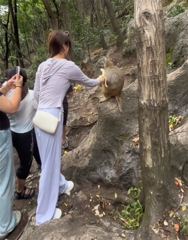 近日有女子在贵州黔灵山景区碰到了一只猴子,玩心大发的她亲手剥了一根香蕉试图递给这只猴子。
