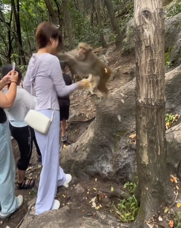 女子轻轻碰了下这只猴子的手臂,野猴转过身来,根本不看她手里的香蕉,而是直接高高跃起扑到她身上,随后双腿用力一蹬又跳到了旁边的树上。