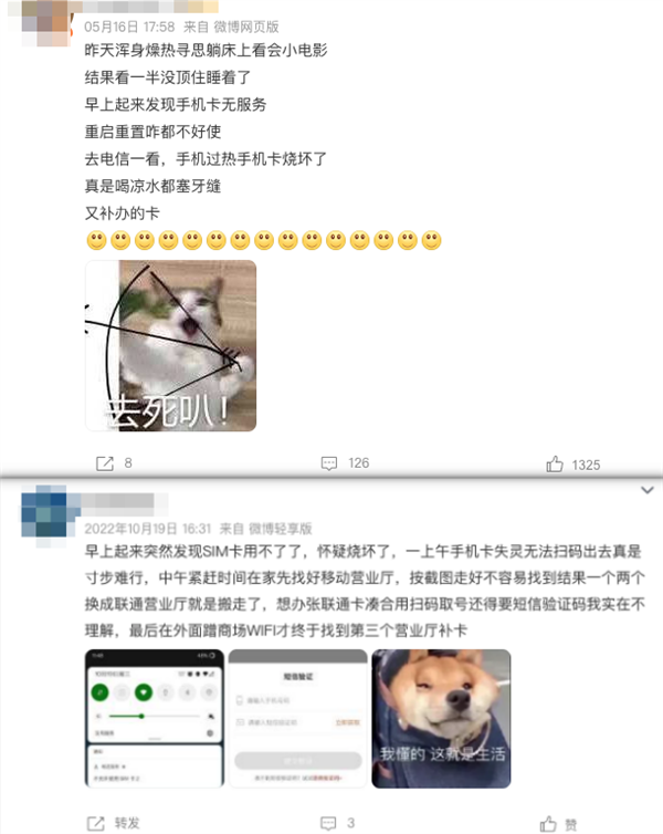 我们上微博一搜,发现遇到米罗这种情况的人还有不少,都说是用着用着就无服务了,去营业厅一看发现 SIM 卡烧了。