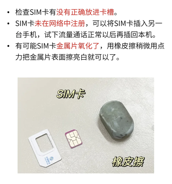 但是只要把 SIM 卡取出来,把已经磨损到发黑的触点部分用橡皮擦把黑色擦掉,重新插回到 iPhone 里,就又能重新识别了。