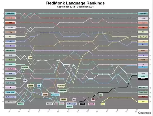 RedMonk 基于 GitHub 代码库与 StackOverflow 标签的排名显示,过去 12 年 Java 始终位列前三。尽管部分开发者因谷歌将 Kotlin 定为 Android 主要语言而转向 Kotlin,但 Java 在企业级开发中的地位依旧稳固。