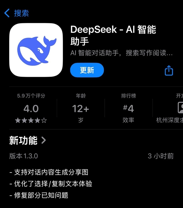 8月14日消息,根据手机应用商店显示,DeepSeek App今天发布了1.3.0版本更新,支持对话内容生成分享图功能。