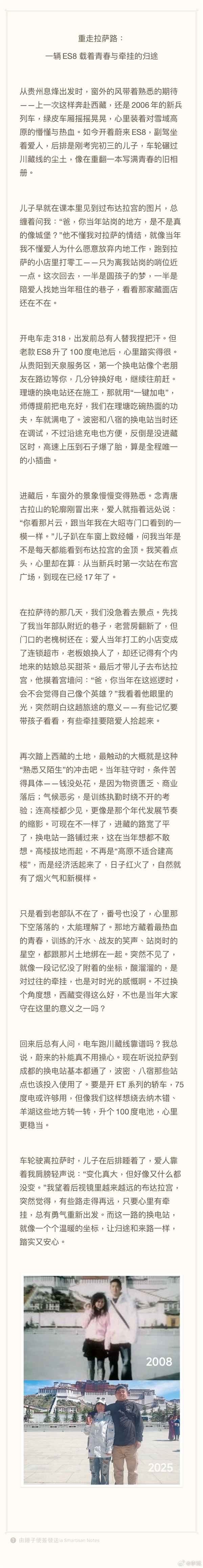 8月13日消息,蔚来汽车创始人、董事长、CEO李斌今日分享了一条“援藏老兵夏小宝时隔19年重走G318回到拉萨”的故事。