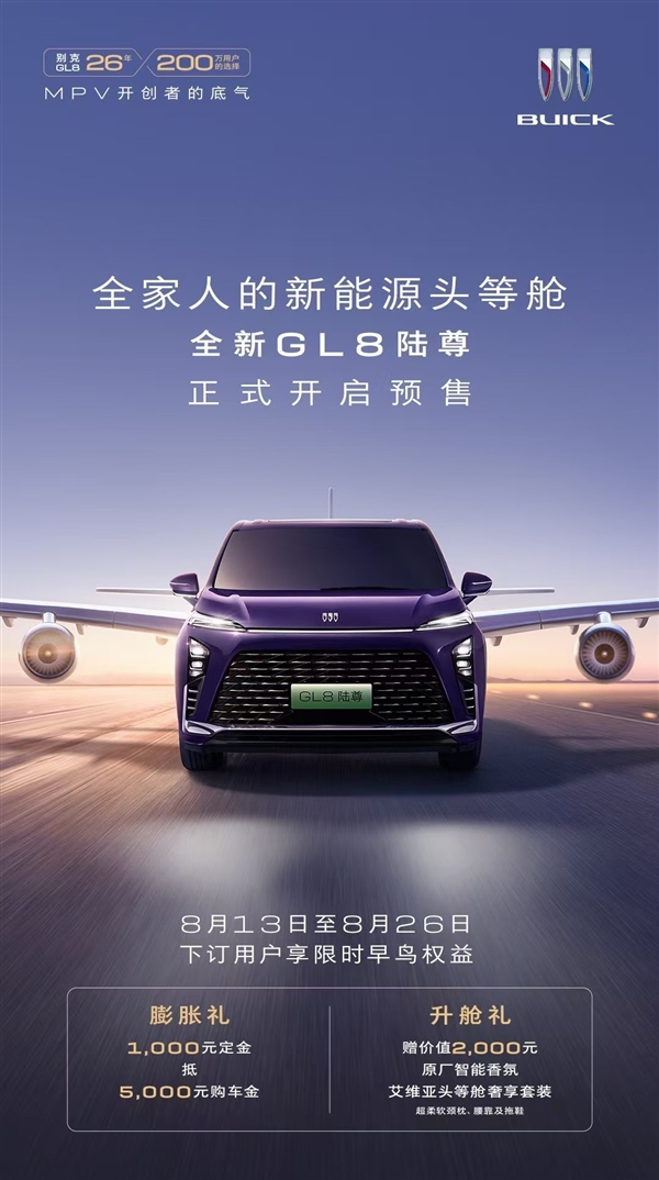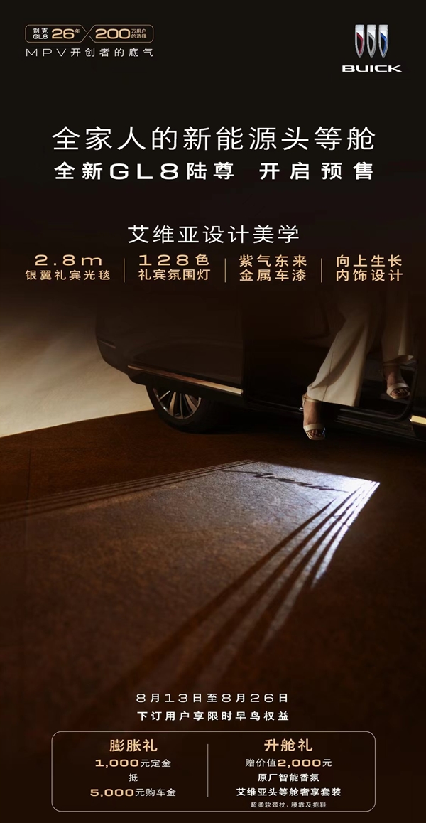 在8月13日至8月26日下订用户享限时早鸟权益,包含1000元定金抵5000元购车金;赠价值2000元原厂智能香氛艾维亚头等舱奢享套装(超柔软颈枕、腰靠及拖鞋)。
