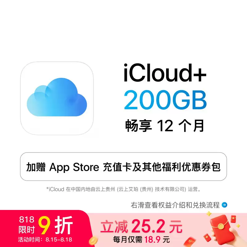 京东 iCloud+ 200GB 12 个月 21 → 18.9 元 / 月折后 226.8 元领 9 折券
