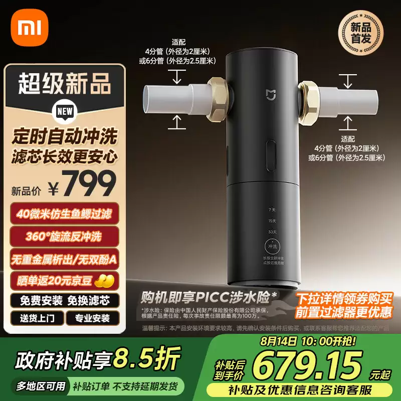 8 月 15 日消息,小米米家前置过滤器 Pro 现已在京东等平台开售,到手价 799 元(注:券后 769 元,国补到手价 679.15 元起)。
