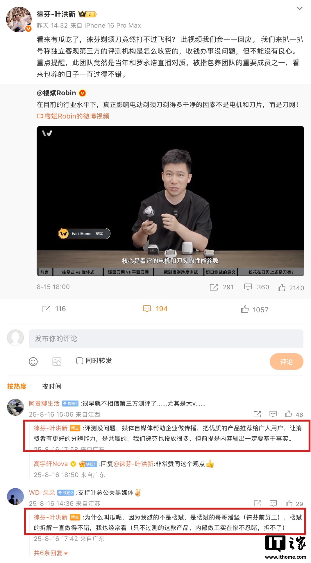 8 月 17 日消息,徕芬 CEO 叶洪新昨天下午 4 点在微博转发博主 @楼斌Robin 的测评视频并配文称,“看来有瓜吃了,徕芬剃须刀竟然打不过飞科?此视频我们会一一回应。我们来扒一扒号称独立客观第三方的评测机构是怎么收费的,收钱办事没问题,但不能没有良心”。