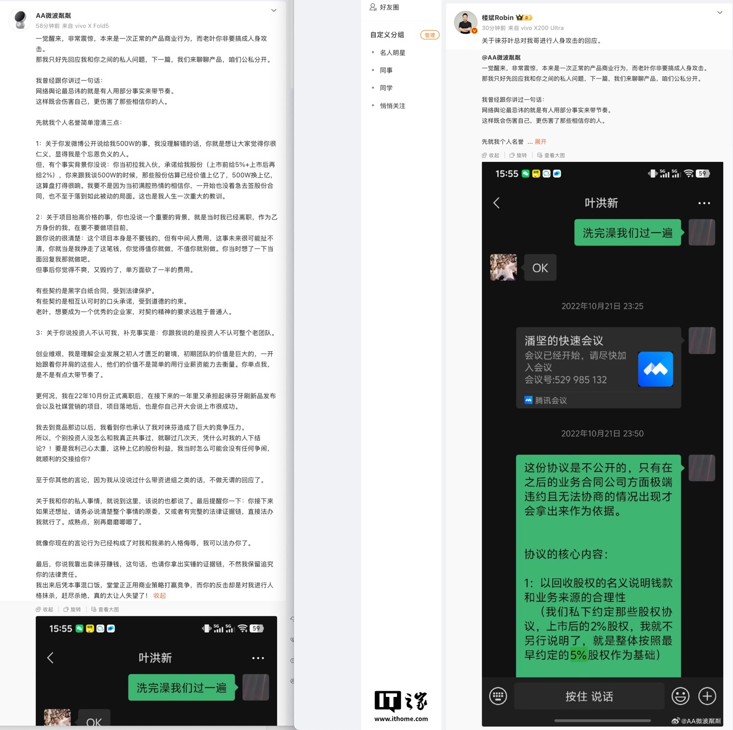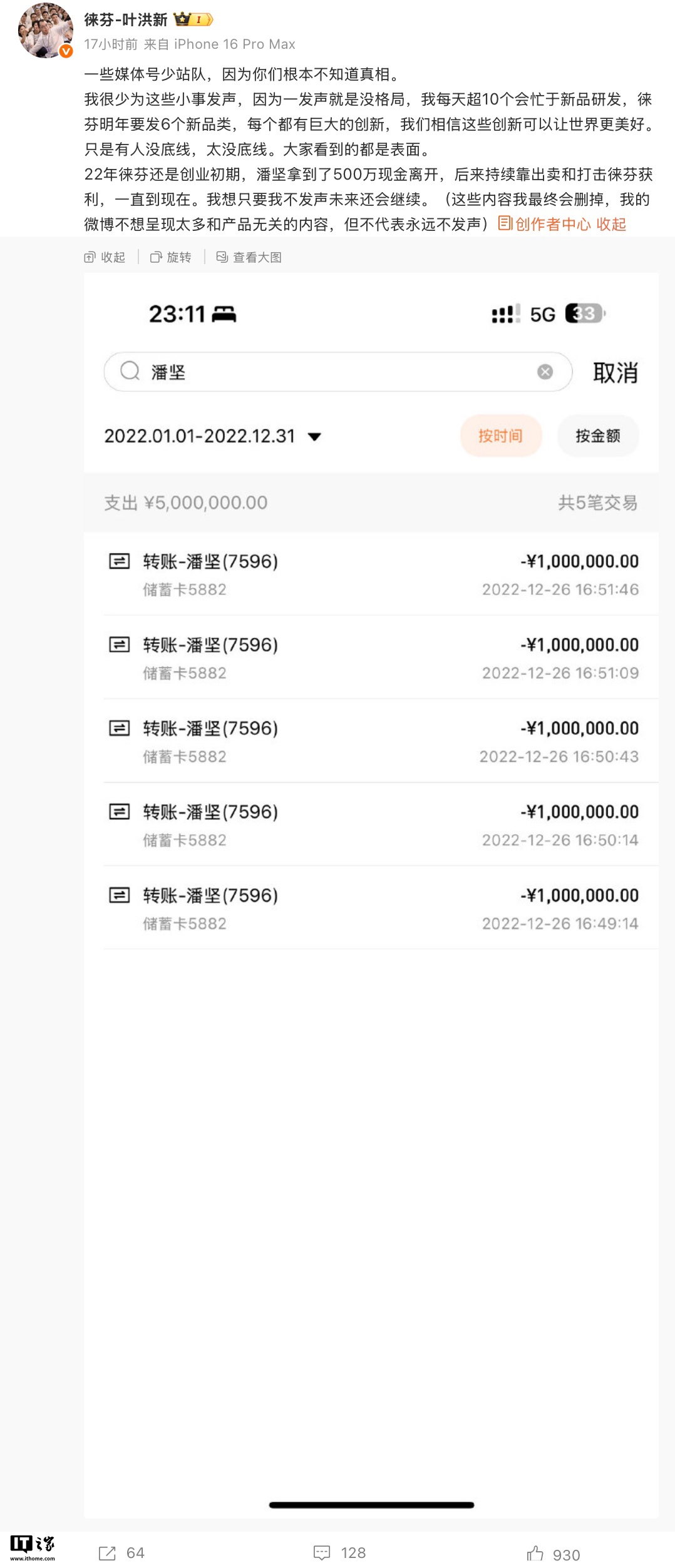 当晚,叶洪新又发文配图,声称“2022 年,潘坚拿到了 500 万现金离开,后来持续靠出卖和打击徕芬获利,一直到现在”。