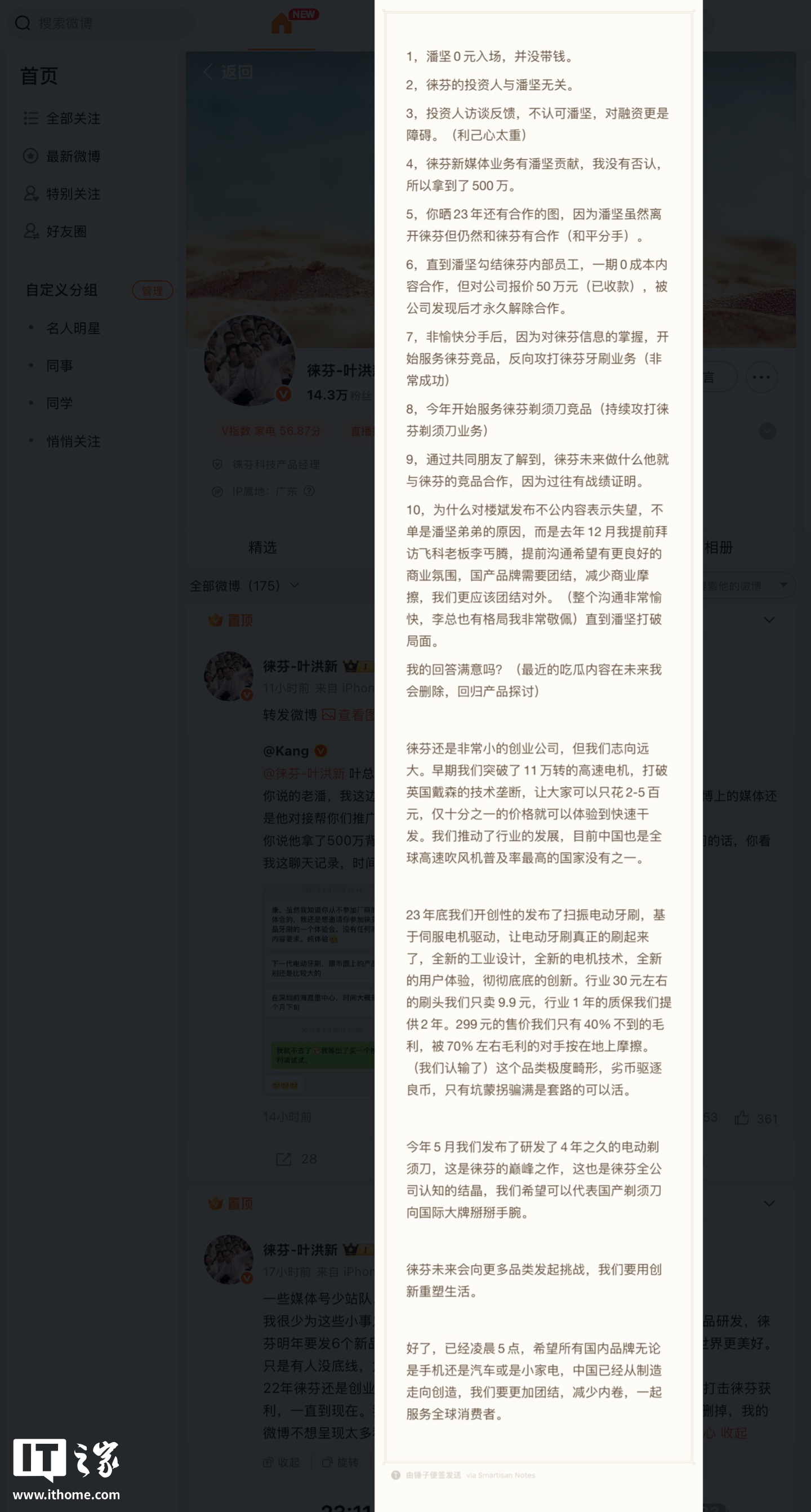 徕芬CEO叶洪新指责前员工潘坚收钱抹黑,潘坚回应称有人断章取义
