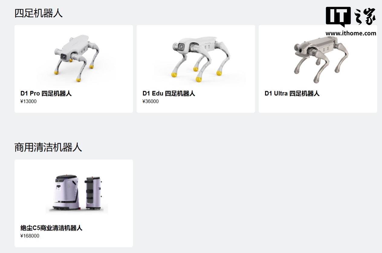 5、D1 四足机器人系列:运控强、续航长、可扩展。D1 Pro / EDU 和 D1 Ultra 分别具备 RL 强化学习运控算法、灵活的运动能力、连续攀爬 16cm 台阶、续航时长 1-2 小时等功能。它们适用于文娱商演、科研教育、安防巡逻、工业巡检等场景。