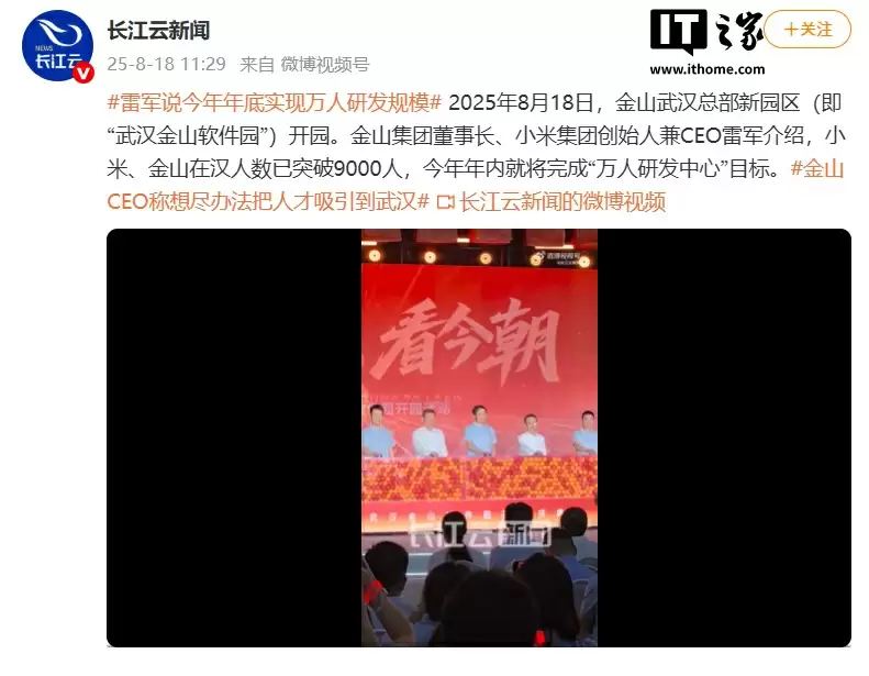 8 月 18 日消息,据长江云新闻报道,今日金山武汉总部新园区(即“武汉金山软件园”)开园。金山集团董事长、小米集团创始人兼 CEO 雷军介绍,小米、金山在汉人数已突破 9000 人,今年年内就将完成“万人研发中心”目标。
