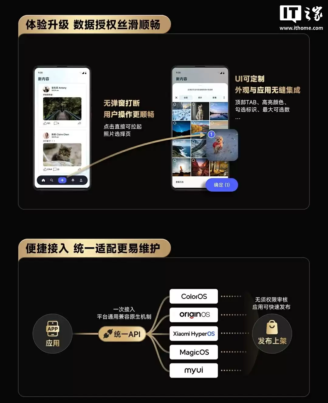 据介绍,OPPO / vivo / 小米 / 荣耀 / 联想联合推出了隐私权限体系,宣称“数据访问双轨并行,兼顾隐私保护与用户体验”,涉及系统能力、应用生态和行业标准,并将基于原生 API 构建系统控件,支持全新数据访问机制、数据授权透明可控、数据授权丝滑顺畅、统一适配维护等特性。