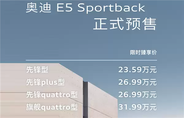8月18日消息,今晚,上汽奥迪旗下全新中型纯电车AUDI E5 Sportback开启预售,共推出4款配置,预售价区间为23.59-31.99万元。
