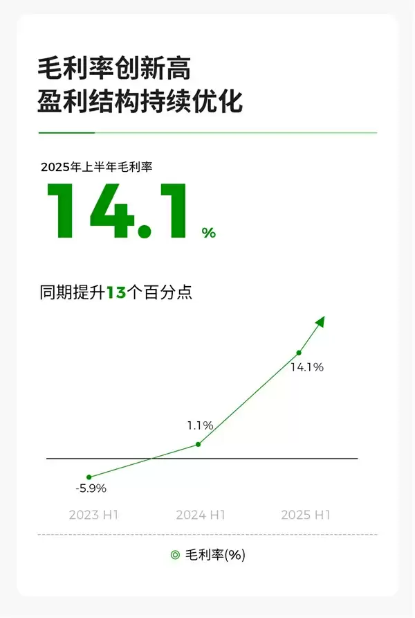 2025年上半年,零跑汽车毛利率为14.1%,较2024年同期的1.1%提升13个百分点。