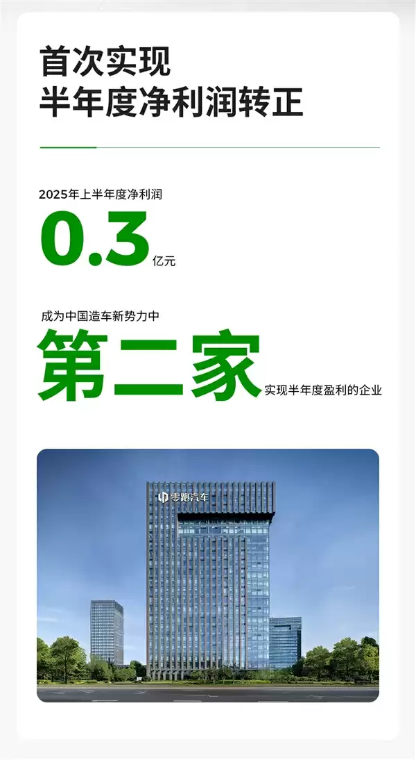 8月18日消息,今日,零跑汽车发布2025年半年度财报,公司半年度净利润为人民币0.3亿元,首次实现半年度净利润转正,成为中国造车新势力中第二家实现半年度盈利的企业。