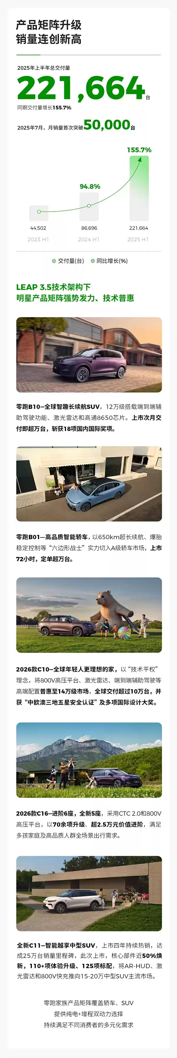 2025年上半年,零跑汽车总交付量为221664台,位居中国新势力品牌销量榜首,较2024年同期交付量增长 155.7%。