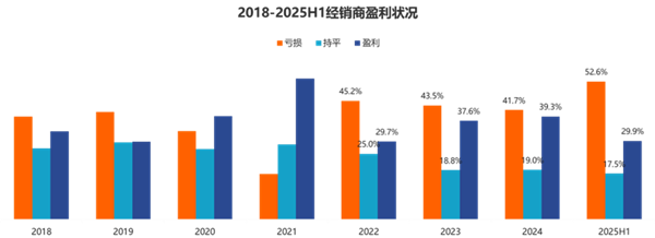 调查显示,2025 年上半年汽车经销商亏损比例上升至52.6%,持平比例17.5%,盈利比例29.9%。