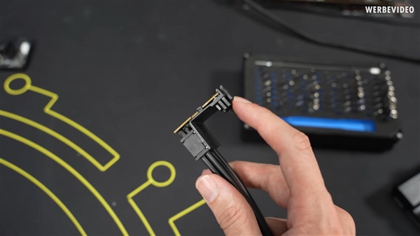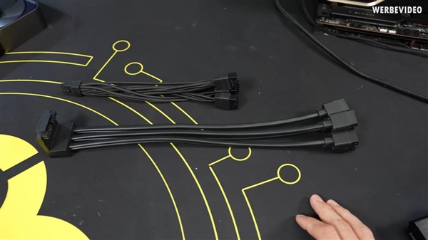 NVIDIA甚至制作了一个原型适配器,将6个8针PCIe插头转两个12VHPWR,这表明该显卡可能计划支持高达900W的功耗(每个8针理论上可提供150W,总功率900W)。