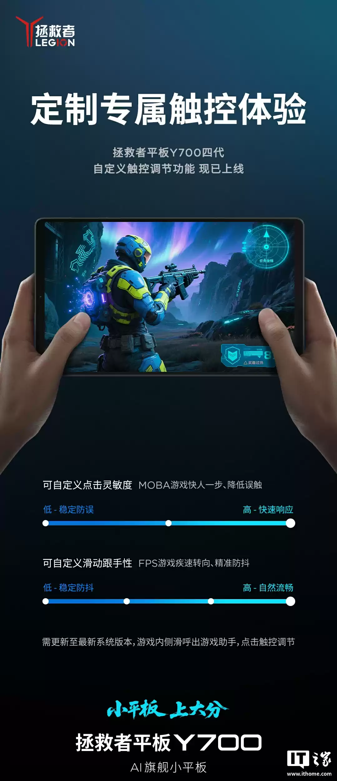 8 月 19 日消息,联想拯救者官方微博今日宣布,拯救者平板 Y700 四代「自定义触控调节功能」上线,可自定义点击灵敏度、自定义滑动跟手性等,适配 MOBA 游戏和 FPS 游戏。