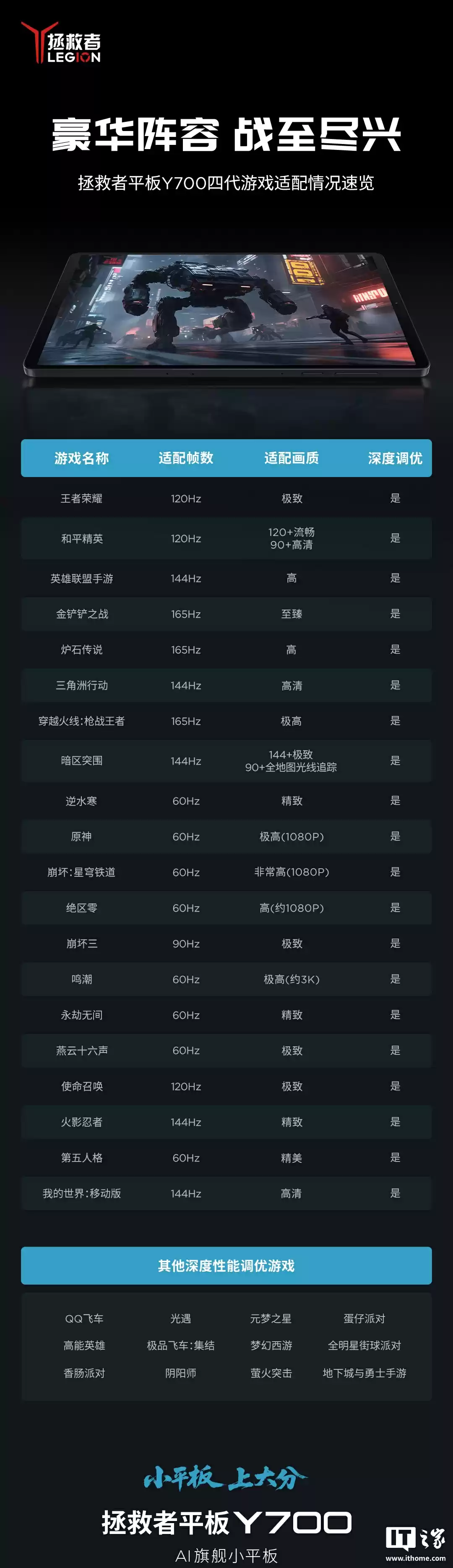 据此前报道,联想拯救者官方微博今年 6 月公布了拯救者平板 Y700 四代游戏适配情况,其中 20 款游戏高帧 / 高画质适配、共计 30+ 游戏深度性能优化。