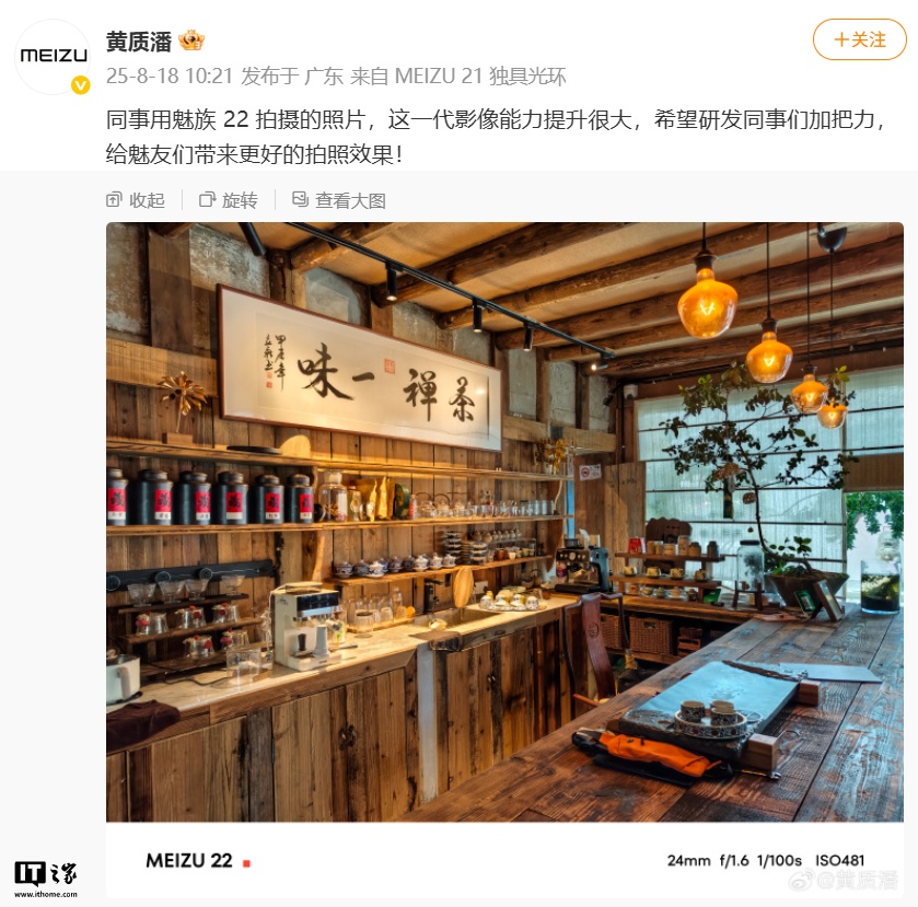 星纪魅族集团 CEO 黄质潘昨天爆料,这台手机的后摄阵容是主摄 24mm f/1.6、长焦 72mm f/2.4,具备等效 3 倍光学变焦的特性。