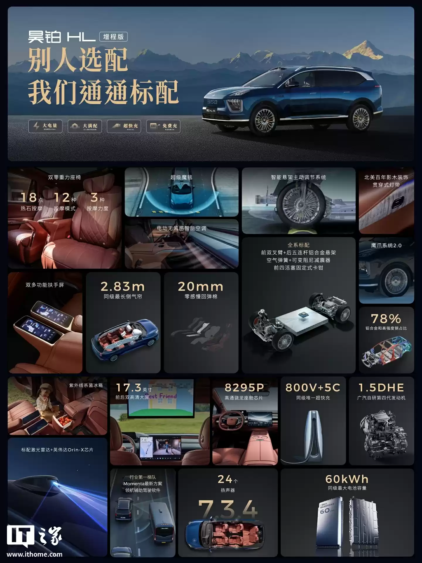 智能驾驶方面全系标配激光雷达和英伟达Orin芯片,搭配广汽GSD高级辅助驾驶系统。底盘采用双叉臂+五连杆铝合金悬架,配备双腔空气弹簧、可变阻尼减震器等豪华配置。