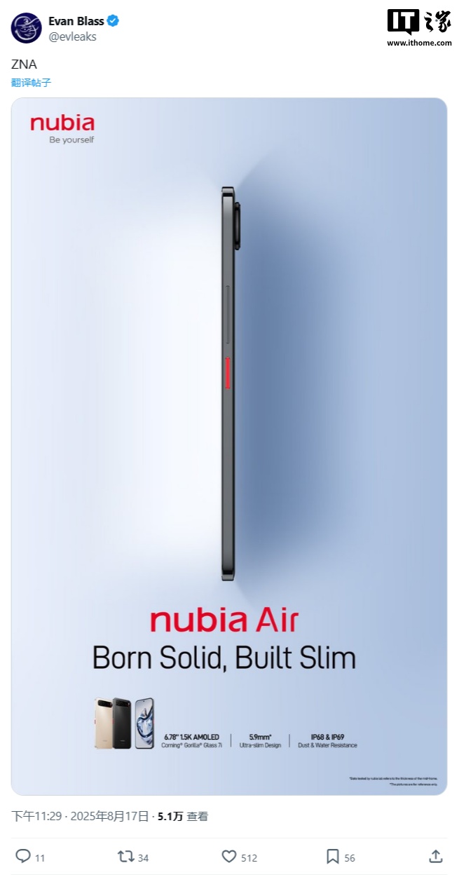 8 月 19 日消息,消息源 @evleaks 昨日(8 月 18 日)在 X 平台发布系列推文,分享了一组宣传图,展示了努比亚(Nubia)即将推出的全新超薄手机 Nubia Air,曝光了该机多角度渲染图与详细硬件参数。