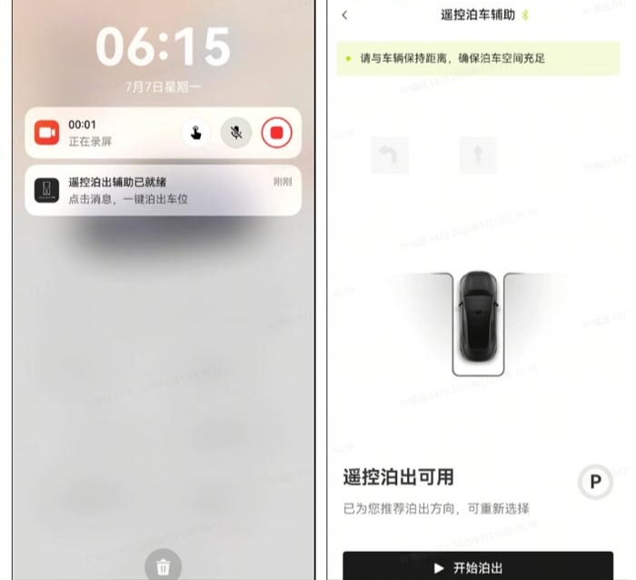 据介绍,这个功能主要为地下车库等场景设计,在车机上打开“遥控泊车辅助一键泊出”功能后,用户在拿着手机靠近汽车时就会收到“遥控泊出辅助已就绪”的推播通知,点击通知即可一键打开汽车 App,可一键开启泊出功能。