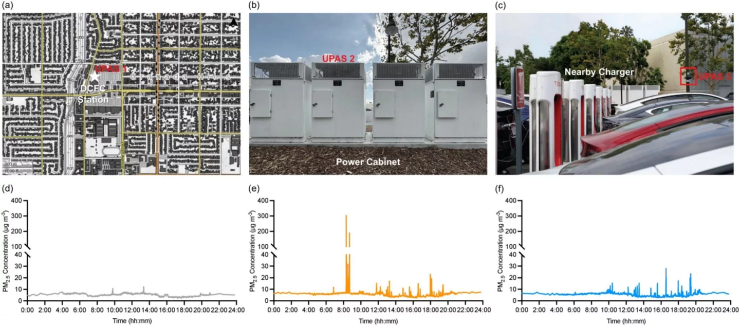 研究人员指出,充电站的最高颗粒物浓度出现在充电站的配电柜附近,但距离配电柜仅几米远时,浓度就会显著下降。他们还提到,距离充电站几百米远的地方,空气污染水平与城市背景水平相比并无明显差异。