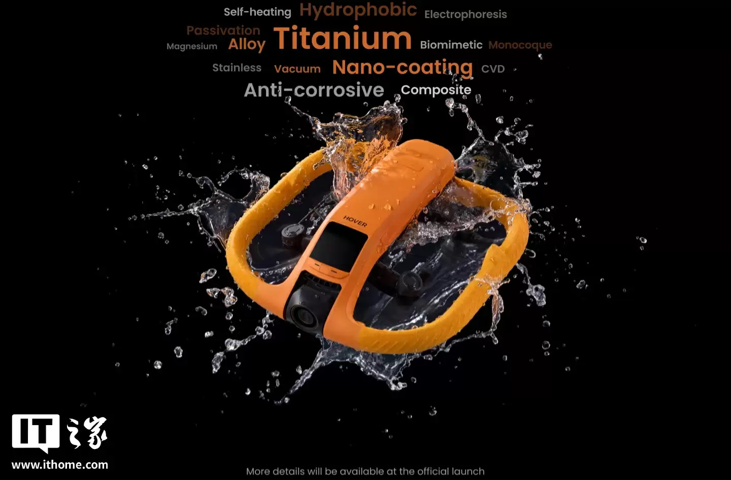 其他方面,该无人机正面配有一块显示屏,预计是帮助用户进行一键自拍用途。无人机整体重量 249 克,应用了钛合金材质、真空纳米涂层,可有效保持刚性、同时实现抗海水腐蚀等特性,可漂浮在海面上,实现“丢进水中起飞”。