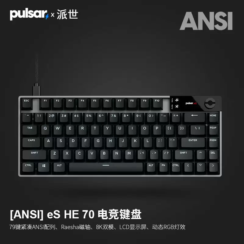 8 月 19 日消息,Pulsar 派世昨日宣布推出 eS HE 70 ANSI 霍尔效应磁轴机械键盘。其采用 ANSI 式的 79 键 70% 配列,支持可插拔线材的 USB-C 有线连接,拥有 8KHz 回报率和 8KHz 扫描率。